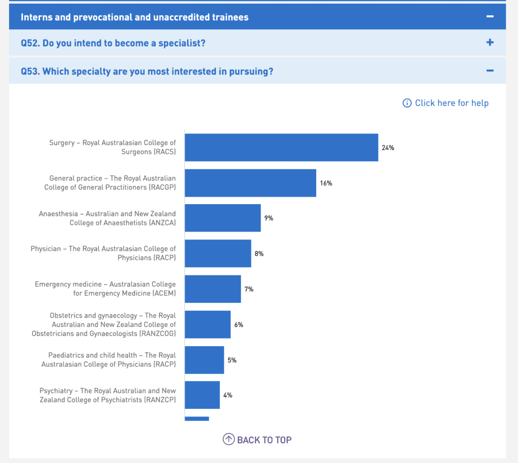 With the results of 59 headline questions reported across several different segments, including interns, prevocational and unaccredited trainees, IMGs and specialty trainees. With the main report running 249 pages, several other reports drilling down to College level, State and Territory level and even an Aboriginal and Torres Strait Islander report. As well as an online interactive dashboard and a page where you can customize your own reports. There’s truly something for everyone in it.